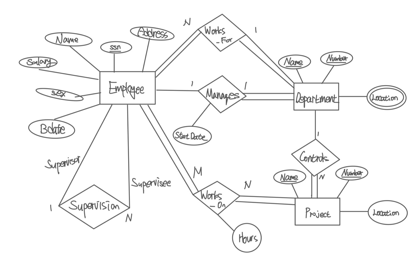 또한, 사원과 부서에 대한 새로운 관계인 "속하다(WORKS_FOR)"가 등장한다. 한 사원은 한 부서에 속하므로 N:1의 관계를 가진다. 여러 사원이 한 부서에 들어갈 순 있으므로 1:1이 아닌 N:1이다. 또한, 사원이 없는 부서는 없으며 모든 사원은 부서에 속해 있으므로 둘 다 Total Participation이다.