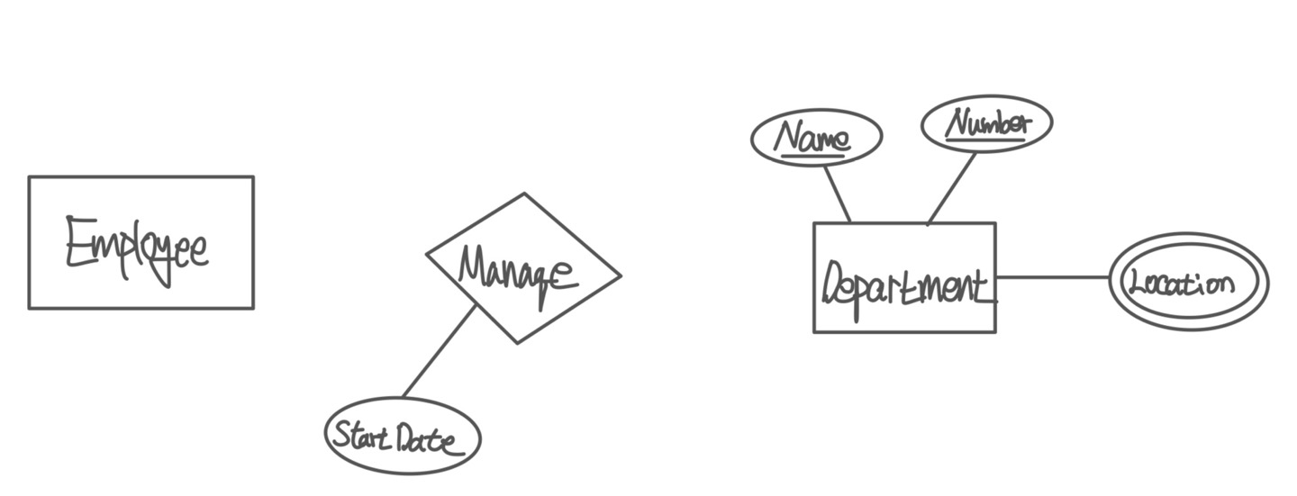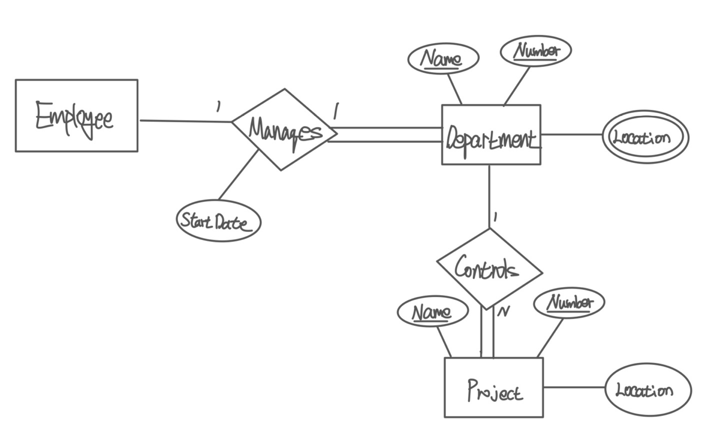 앞서 사원과 부서의 관리하는 관계를 정의 해 보면, 부서는 관리하는 사원이 없으면 안되므로 Total Participation이며, 모든 사원이 부서를 관리하지는 않기에 Partail Participation이다. 그리고 각 부서마다 부서를 관리하는 특정 사원이 있으므로 1:1 관계임을 유추할 수 있다.