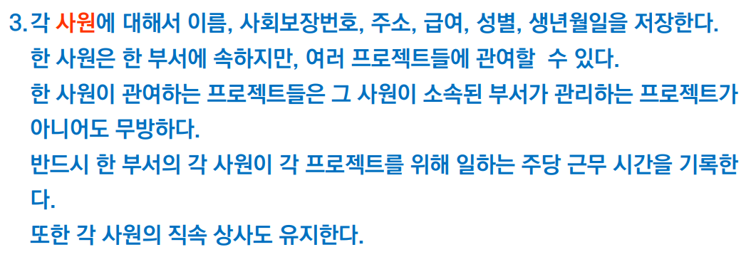 세번째 요구사항에서는 사원 Entity에 대한 Attributes가 등장한다. 이름, 사회보장번호, 조수, 급여, 성별, 생년월일을 Attribute로 가진다.