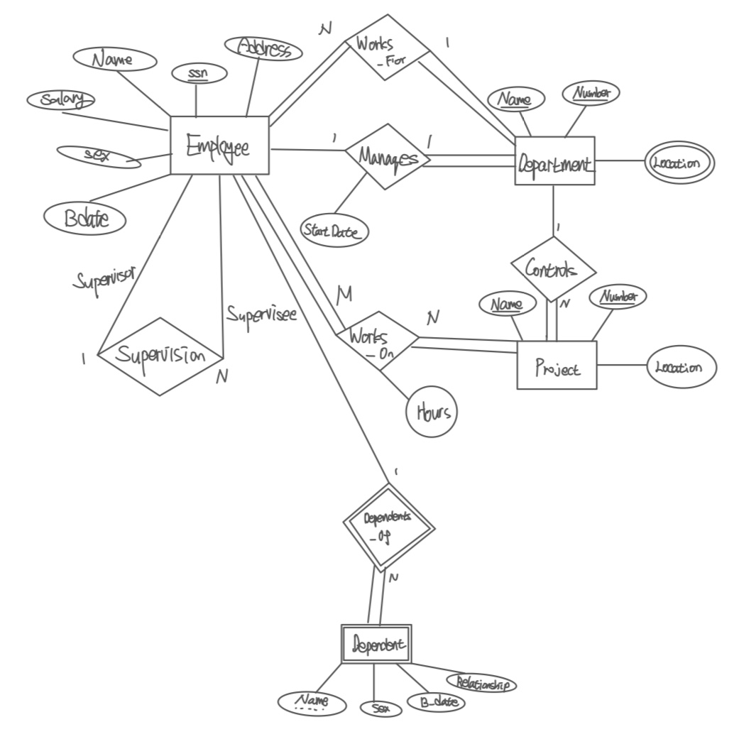 또한, 사원과 부서에 대한 새로운 관계인 "속하다(WORKS_FOR)"가 등장한다. 한 사원은 한 부서에 속하므로 N:1의 관계를 가진다. 여러 사원이 한 부서에 들어갈 순 있으므로 1:1이 아닌 N:1이다. 또한, 사원이 없는 부서는 없으며 모든 사원은 부서에 속해 있으므로 둘 다 Total Participation이다.