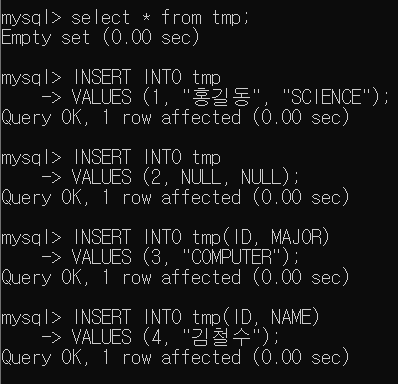 기본적으로 Primary Key를 제외한 Attribute는 NULL을 허용한다. 만약 NULL을 제한하고 싶으면, 아래 tmp Table의 ID Attribute와 같이 NOT NULL 제약조건을 지정하면 된다.