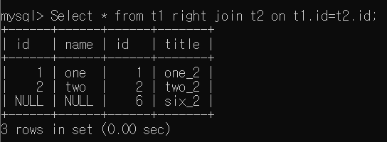 그렇다면, t2 Table에 t1에 없는 id를 가진 tuple을 추가해서 동일한 연산을 해 보자 . right join은 오른쪽 Table을 다 가져오고, 중복되는 행이 있으면 해당 데이터를 가져오고 없으면 NULL이므로 id 6에 대한 t2 Table의 id, name Value는 모두 NULL이 될 것이다.