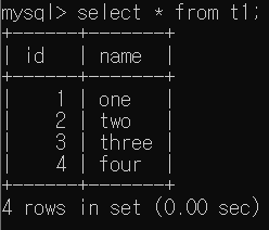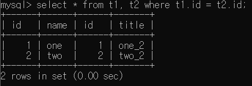 select * from t1, t2 where t1.id = t2.id 로 실행한 결과는 아래와 같다. Equi Join의 결과인데, 확실히 Table 간의 관계를 나타내기에 t1, t2 Table의 정보가 모두 나타나고 이는 In 조건과는 차이가 있음을 확인할 수 있다.