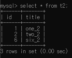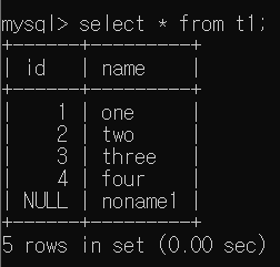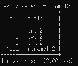 NULL이 있는 상황을 구현하기 위해 t2 Table에 id = NULL, title = "noname1_2"인 Tuple을 추가하였다.