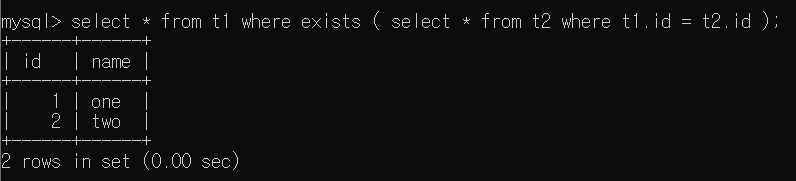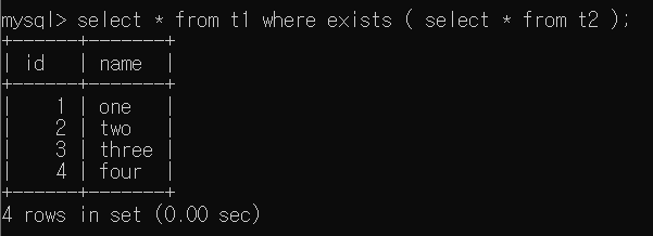 여기서 메인 쿼리는 select * from t1, 서브 쿼리는 EXISTS 연산자 뒤에오는 ()내의 select * from t2이다. 즉, t1 Table의 모든 Column 중에서 서브 쿼리가 True인 것만 반환되는데, 여기서 select * from t2 이므로 t2 Table에 1개의 Tuple이 있으면 True이다. 따라서 t1 Table이 모두 반환 될 것이다.