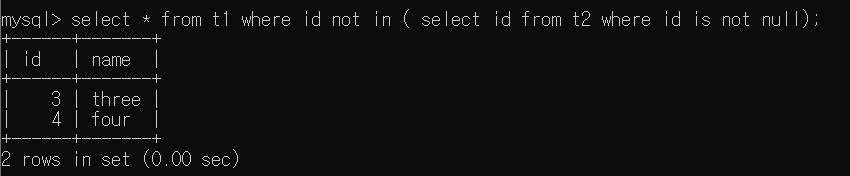 NOT IN 조건 내의 WHERE에 의해 t2 Table에 id가 NULL이 아닌 값들 중, t1 Table에 id가 없는 경우는 id = 3, 4이므로 오른쪽 아래 결과 나온다.