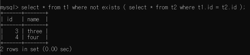 not exists의 경우 서브 쿼리를 만족하지 않는 경우 즉, False인 경우 반환된다. 직관적으로 t1 Table에서 id가 3, 4인 Tuples가 반환 될 것 같으며, 3=NULL 비교의 경우 False이기에 정상적으로 반환 될 것이라고 예측할 수 있다.