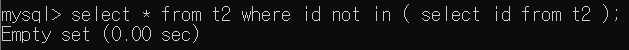 NOT IN 조건의 경우 IN 조건과 반대로 ()안에 없는 경우를 반환한다. 즉, t2 Table의 id에 있는 id를 가지지 않는 t1 Table의 모든 Column을 반환하라는 의미이다.