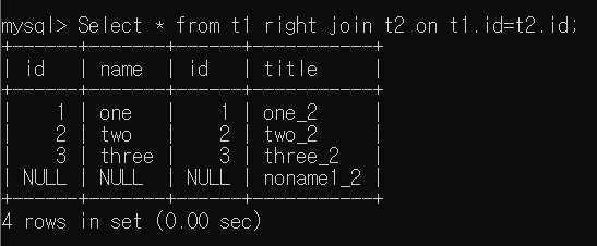 - Select * from t1 right join t2 on t1.id=t2.id
