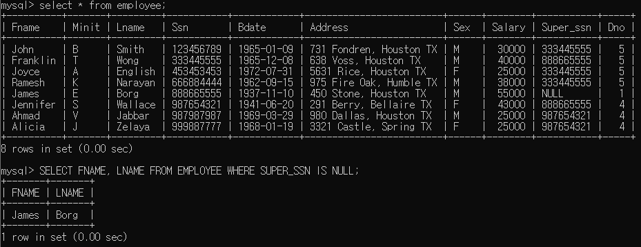 EMPLOYEE Table에서 SUPER_SSN이 NULL인 Tuple에 대하여 FNAME, LNAME Column을 출력해라는 의미이다. 실제로 MySQL이 동작할 때는 대, 소문자에 대한 구분이 없으니 참고하자.