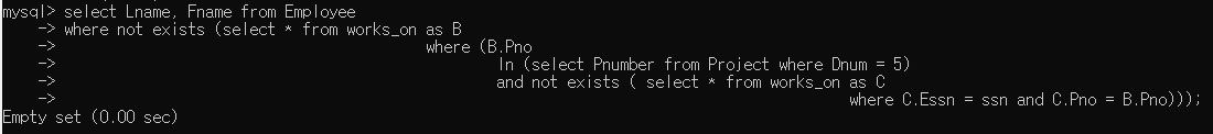 존재하지 않는다 즉, 공집합이 없다이므로 NOT EXISTS()로 내부 질의는 시작된다. 이후 구성해야 하는 공집합은 5번 부서가 관리하는 프로젝트 넘버 집합과, 해당 집합에 포함된 프로젝트에 근무하지 않는 집합으로 구성된다. 그리고, 프로젝트에 근무하지 않는 집합 역시 NOT EXISTS()로 표현할 수 있다.