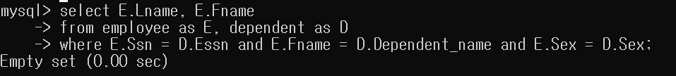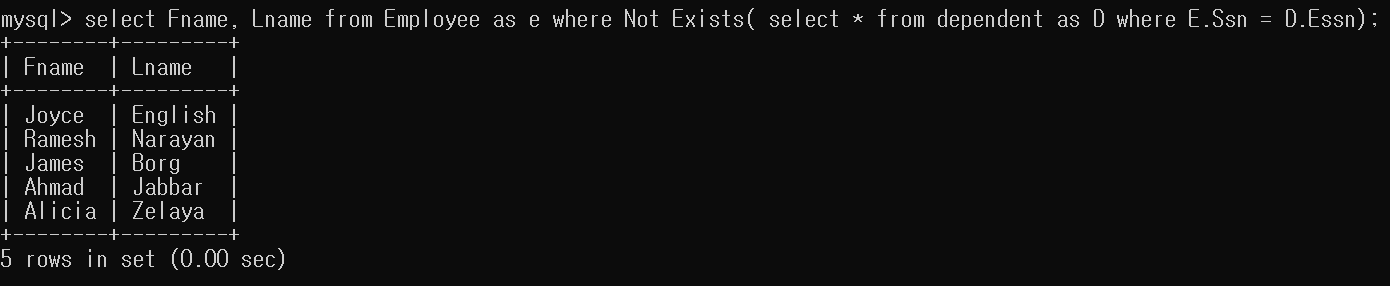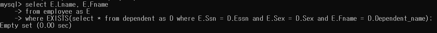 관리자는 Department Table의 Mgr_ssn을 Ssn으로 가지는 Employee Table의 Tuple을 반환하면 되고, 부양가족이 있어야 하므로 Dependent Table의 Essn을 Ssn으로 가지는 Employee Table의 Tuple이 반환된다. 따라서 두 Exists문이 and로 연결 되어 있으므로 두 집합의 공집합이 반환 된다.