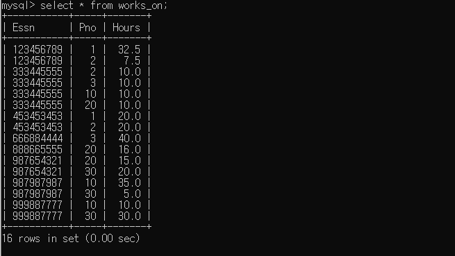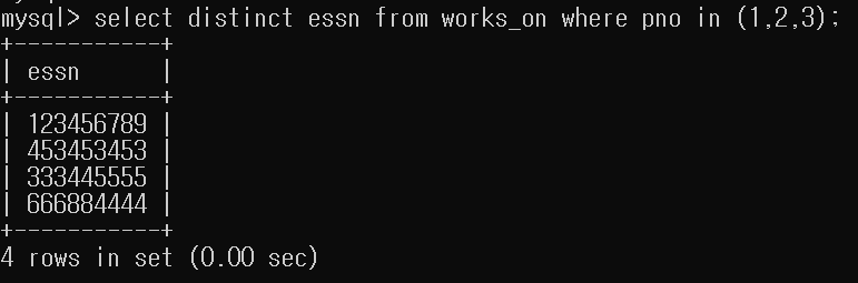 - 프로젝트 번호 1,2,3에서 일하는 모든 종업원들의 Ssn을 검색하시오