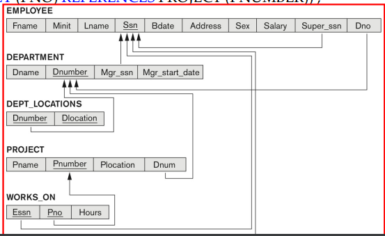 프로젝트를 담당하는 부서의 관리자면서 성이 'Smith'고 프로젝트의 참여하는 종업원의 PNUMBER는, SELECT PNUMBER FROM PROJECT, DEPARTMENT, EMPLOYEE WHERE MGR_SSN = SSN AND DNUM = DNUMBER AND LNAME = 'Smith' 이다. 부서의 관리자여야 하므로, DEPARTMENT Table의 Magr_ssn을 Ssn으로 하는 EMPLOYEE 면서, 그 부서 프로젝트를 담당해야 하므로, PROJECT Table의 Dnum을 Dnumber로 하는 DEPARTMENT여야 한다.