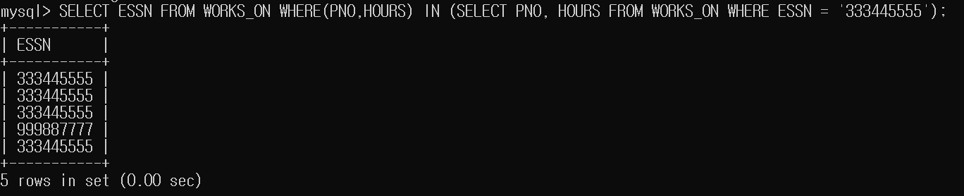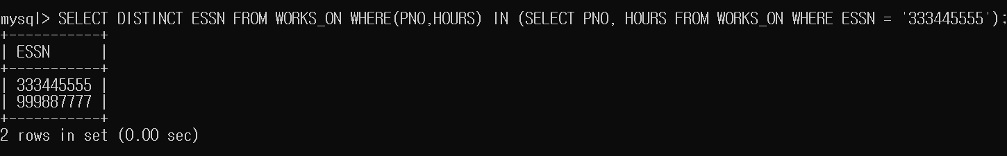 이전보다 쉬운 질의 이다. 사원의 Essn이므로, SELECT SSN FROM WORKS_ON 이다. 조건문의 경우, Essn 이 333445555인 사원이 일하는 프로젝트와 일한 시간의 조합이 동일해야 한다. 먼저 WORKS_ON Talbe에서 Essn이 333445555인 Tuple들을 추려야 하므로 SELECT PNO, HOURS FROM WORKS_ON WHERE ESSN = '333445555' 이다. 이때, PNO, HOURS가 추려진 PNO, HOURS의 조합에 속한 것만 검색해야 하므로 IN 조건을 사용해야 한다. 최종적으론 다음과 같다.