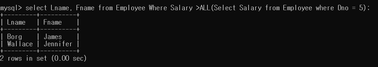 select Lname, Fname from Employee Where Salary >ALL(Select Salary from Employee where Dno = 5);