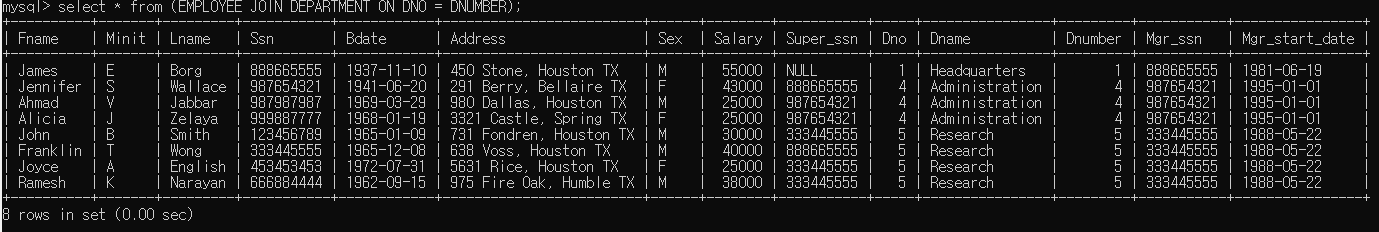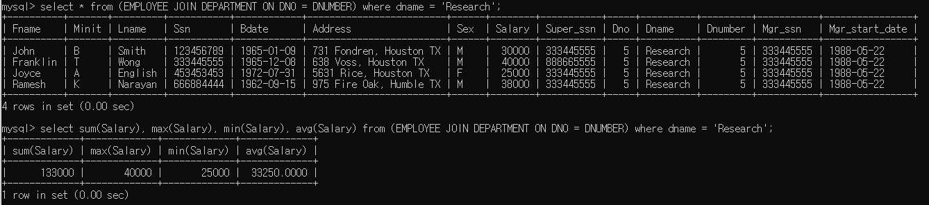 이렇게 하면 Department Table의 Dno와 Employee Table의 Dnumber가 같은 경우 Column이 연결되어 하나의 Table로써 활용할 수 있다. 따라서 이제는 해당 Table에서 Dname이 'Research'인 Tuple만 찾아서 해당 Tuples의 급여의 합, 최고 급여, 최저 급여, 평균 급여를 구하면 된다.