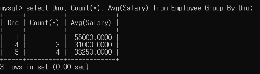 Employee Table의 Dno를 기준으로 Grouping 된 Group 내에서 각각의 집단한수가 적용됨을 확인할 수 있다.