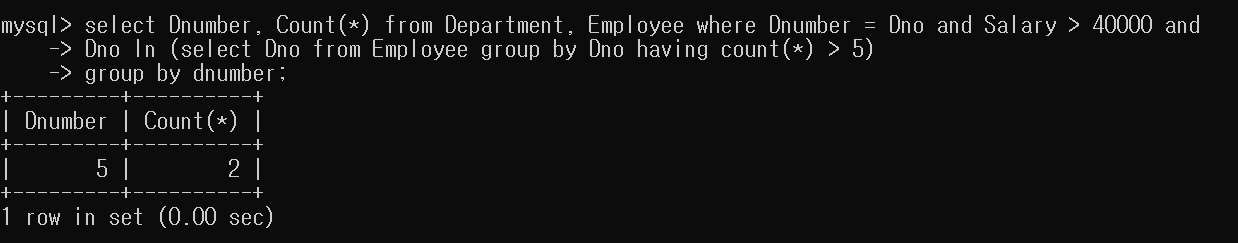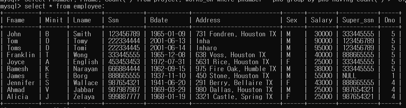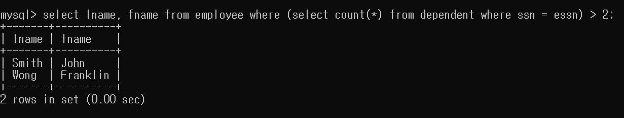 둘 이상임을 판단하기 위해서 count(*)로 ssn = essn인 Tuple의 수를 측정하였고 이는 부양 가족의 수를 의미한다.