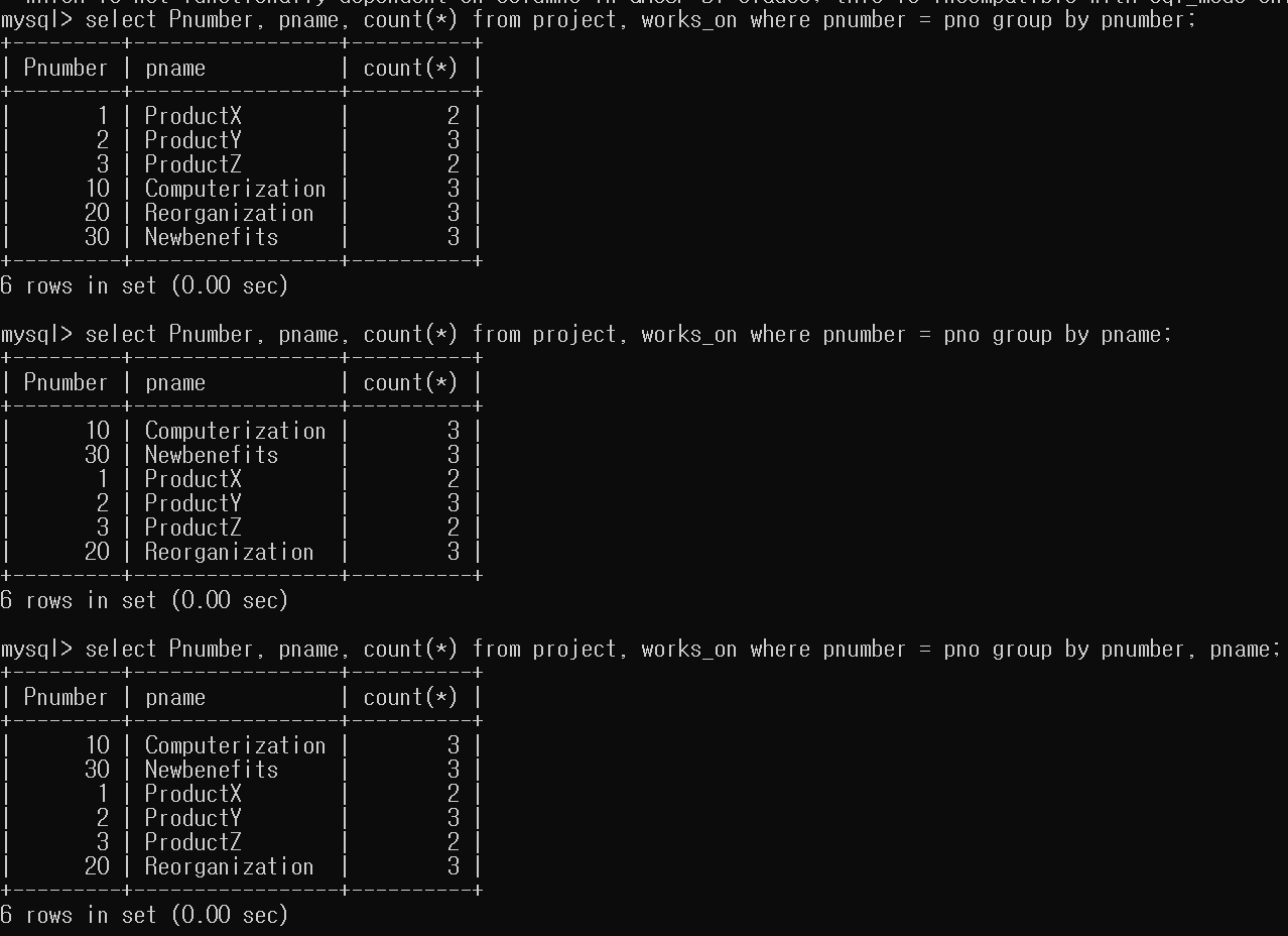 굳이 Pnumber, Pname으로 Group By를 할 필요 없이 둘 중 하나만 해도 결과는 동일하다. 하지만, Ordering의 차이가 존재한다.
