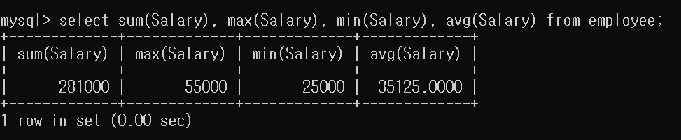 select sum(Salary), max(Salary), min(Salary), avg(Salary) from employee;