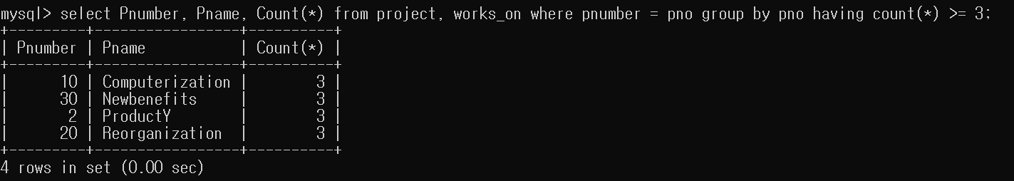 앞선 질의와 유사하지만, 각 프로젝트에 3명 이상의 사원이 근무해야 한다. 따라서 Having을 통해 GROUP BY로 묶인 Group에 대하여 3명 이상이라는 조건을 걸면 된다.