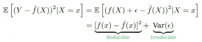 다음과 같이 전개할 수 있다. 여기서 $\epsilon$은 측정 오차로 줄일 수 없는 값이다. 따라서 우리의 목적은 $[f(x) - \hat{f(x)}]^2$를 최소로 하는 것이다. 여기서 $f(x)$는 True $y$를 의미한다.