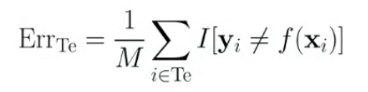 $ERR_{Te}$는 Class를 맞춘 비율로 해석하면 이해하기 쉽다. 이때 $I$는 $y_i = f(x_i)$이면 1 아니면 0이다.