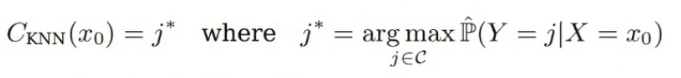 따라서 $x_0$와 가장 가까운 $K$개의 Training Dataset이 가지는 Class 중 가장 많은 Class를 $y$( = $j^*$)로 함을 의미한다.