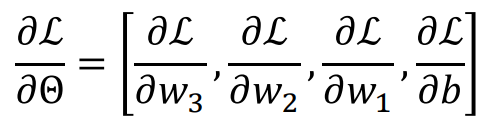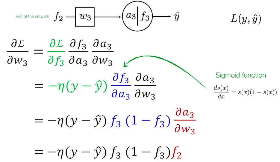 각각의 편미분을 계산 해 보면 다음과 같다. 이때, Loss Function $L$은 L2, Activation Function $f$는 Sigmoid, $a_3 = f_2 \cdot w_3$임을 기억하자.
