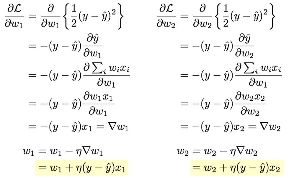 여러개의 Perceptrons가 있는 경우 $\hat{y} = \sum w_ix_i$로 표현할 수 있다. 따라서 Update 과정에서 각 Perceptron의 Weight $w_i$의 편미분을 구해 Gradient를 계산한다면, $w_i = w_i - \bigtriangledown w_i$로 Update 할 수 있다.