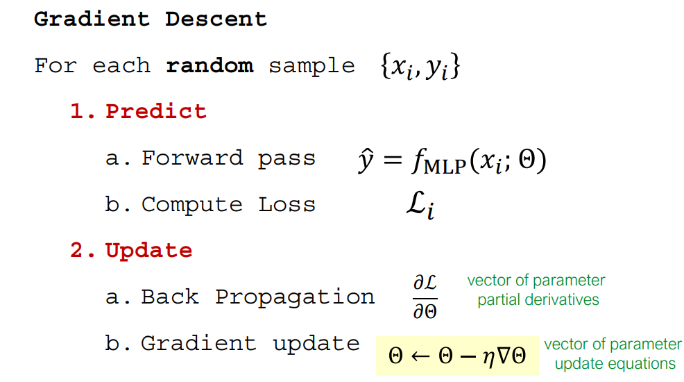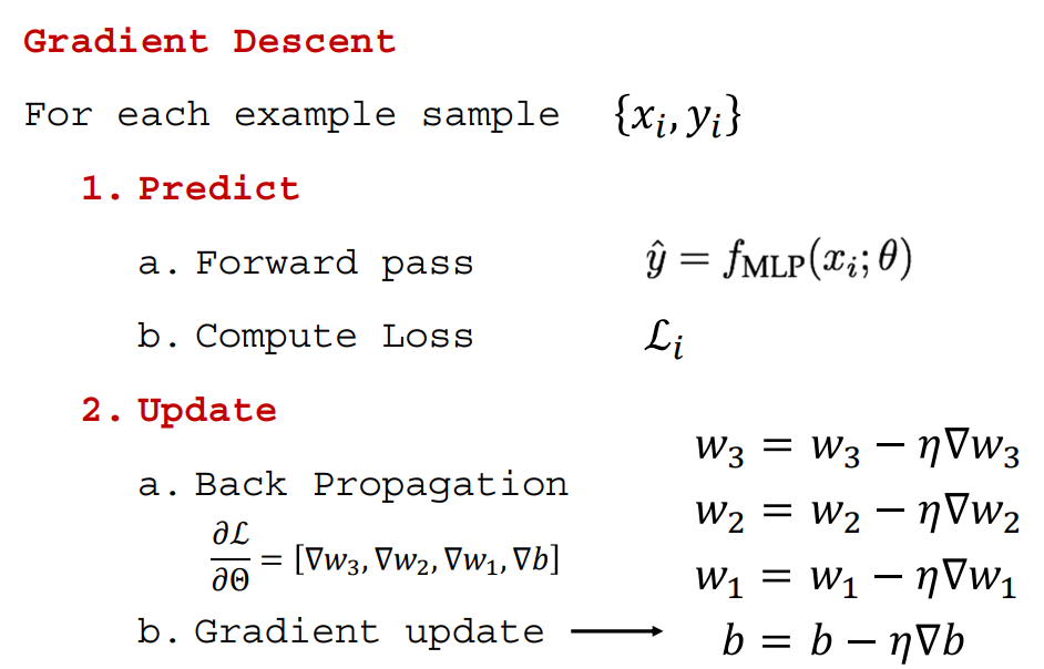 이전에 Perceptron, Multi Perceptrons의 학습 과정을 MLP에 대입해 본다면 다음과 같다. Forward Pass로 추정한 뒤 Loss를 계산하고, 각 Parameter에 대하여 편미분을 수행해 Gradient Descent 방향으로 Parameter를 Update 하면 된다.