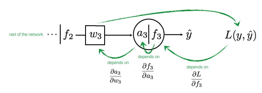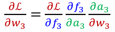 Chain Rule에 의해 분해 해 보면 위와 같이 분해할 수 있는데, 이는 $w_3$가 $ L(y, \hat{y}) $에 미치는 영향을 각 단계별로 표현한 것이다. 즉, $a_3$에 $w_3$가 미치는 정도, $f_3$에 $a_3$가 미치는 정도, $ L(y, \hat{y} ) $에 $f_3$이 미치는 정도를 의미한다.