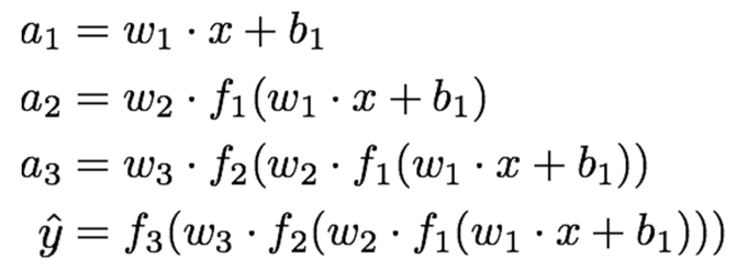$$\hat{y} = f_3(w_3 \cdot f_2(w_2 \cdot f_1(w_1 \cdot x+b_1)))$$
