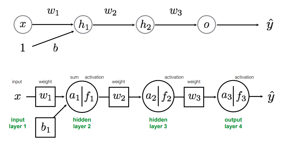 이번에는 1개의 Perceptron으로 구성된 Multi-Layer를 가지는 MLP를 살펴보자. 아래의 MLP는 하나의 Input Layer, 두개의 Hidden Layer, 1개의 Output Layer로 구성된 4개의 Layer를 가지는 MLP이며 $w1, w2, w3, b$ 총 4개의 Parameter를 가진다. 이를 다르게 표현하면 아래와 같이 표현할 수 있다.