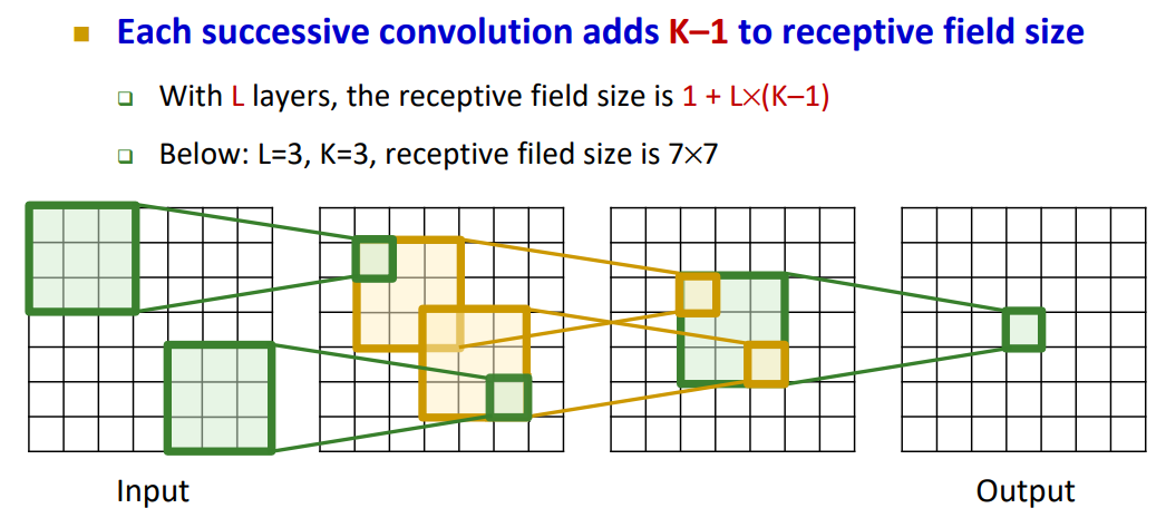 간단하게 수식화 하면, Layer의 개수를 $L$, Kernel Size를 $K$라고 했을 때, Receptive Field Size는 $(1 + L \times (K - 1)) \times (1 + L \times (K - 1))$가 된다. 하지만, Input 영상의 Resolution이 커지면 커질수록, Receptive Field가 Input 영상의 Resolution이 되기 까지 매우 깊은 Layer가 필요하고, 그로인하 Weights의 개수도 많아질 것이다. 따라서 모델이 영상의 전체를 관찰하고 이해하는데 너무 깊은 Layer가 요구됩니다.