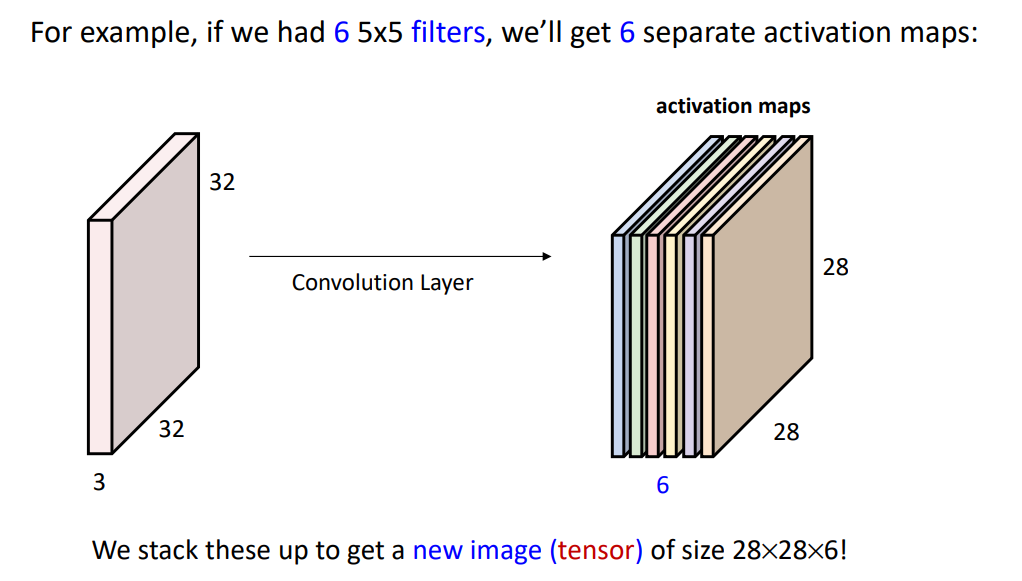 만약 Filter의 개수가 총 6개라고 가정하면, 하나의 Filter와 Input 영상의 Convolution은 Output Tesnor의 한 층을 이루기 때문에 최종적으로 Output 즉 다음 Layer의 Tensor Depth는 Filter의 개수와 동일하게 된다. 그리고 최종적으로 $ 6 \times (5 \times 5 \times 3 + 1)$개의 Weights가 존재한다.