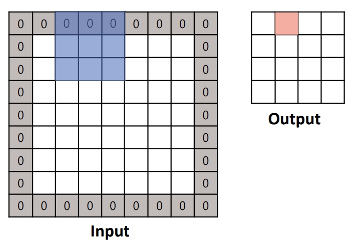 Padding은 아래와 같이 Input에 대하여 전체를 0인 값으로 감싸서 구현할 수 있는데, 이를 통해 Padding을 적용하기 이전에는 Convolution 연산할 수 없었던 Width, Height의 가장자리 픽셀에 대한 연산을 수행할 수 있어 Resolution이 유지되는 것을 확인할 수 있다. 실제로 $7 \times 7$의 Input 영상과 $3 \times 3% Kernel, Stride는 "2"인 Convolution 결과는 $3 \times 3$의 크기를 같는 Output이었지만, Padding 결과 $4 \times 4$로 Resolution이 어느정도 유지됨을 확인할 수 있다.
