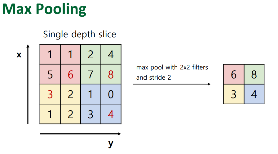 앞서 말한 것 처럼, Stride는 Convolution 과정에서의 Downsampling이지만, Pooling은 Input의 Dimension이 매우 클 때 Downsampling을 하여 차원을 축소하는 기법이다.
