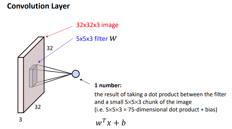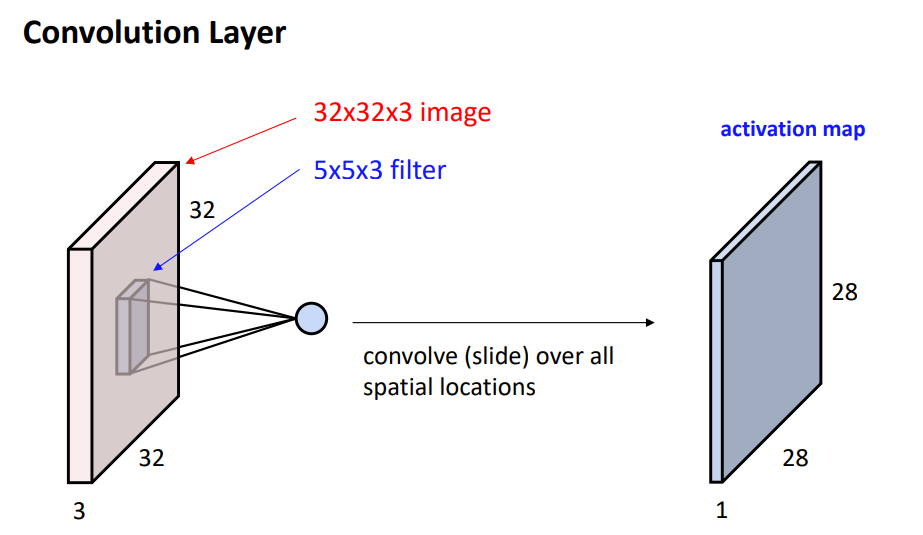 5x5 Filter에 의한 Convolution 연산을 생각해 보자. 이때, Filter는 항상 Input Volume의 Depth와 동일한 Depth를 가짐을 주의하자. 왼쪽 그림과 같이, Convolution 결과 $5 \times 5 \times 3 + 1$개의 Weights가 존재한다. 이때 동일한 Filter를 가지고 Input에 대하여 Convolution을 수행하기 때문에 연산 때 마다 새로운 Weights가 생기지 않는다. 따라서 Fully Connected Layer 보다 학습해야 할 Weights의 수가 적다.