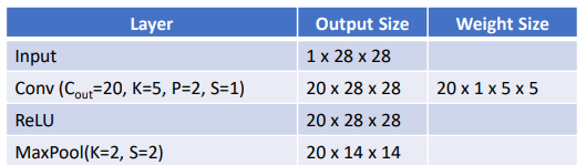 이때, Kerner Size는 5, Padding은 2, Stride는 1이므로 수식에 근거하여 Output의 Size는 같다. 즉, 해상도는 유지하게 된다. 하지만, Kernel의 개수가 20개이므로 Output Size는 20x28x28이 된다. 이때 발생되는 Weight의 경우, 각 Kernel 당 1x5x5개의 Weight가 발생하며 20개의 Kernel이 존재하므로 20x1x5x5개를 가진다.