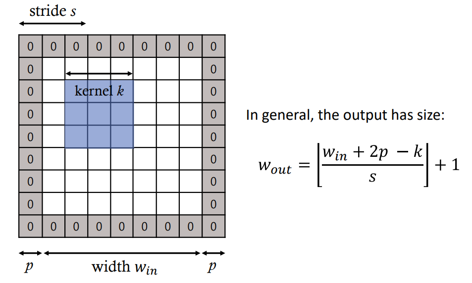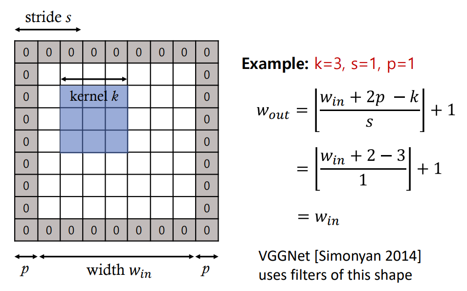 따라서 Stride, Padding을 조합 해 보면, Input ($W_{in}$) , Kernel Size ($k$) , Padding ($p$) , Stride($s$)에 따른 Output의 크기는 왼쪽 아래 사진과 같이 정의된다. 특이사항으로는, Input과 Output의 영상의 크기가 같아지는 경우가 있는데, 실제 VGGNet에서는 이러한 목적으로 해당 조합을 사용하였다. 이때, $ \left \lfloor \right \rfloor$의 경우 Floor Function으로 안의 값을 내림하면 된다.