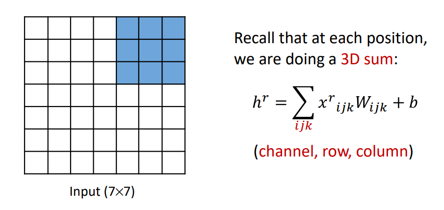 현재 3D에 대하여 Convolution을 수행하기 때문에 $i,j,k$각각은 Channel, Row, Column의 Index를 의미하며, Convolution 수행결과 다음과 같은 결과를 도출할 수 있다.