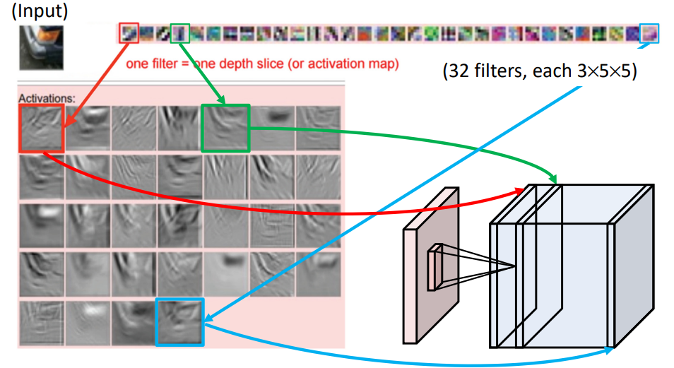 Input 영상에 대하여 5x5 크기의 Fiter를 이용하여 Convolution을 수행한다고 하자. 현재 Input 영상은 R,G,B 3체널이기 때문에 각 Kernel 역시 3x5x5가 된다. 하나의 Filter에 의한 Convolution 및 Activation Function을 거친 결과는 왼쪽의 결과 중 각각이 되고 이는 다음 Tensor의 하나의 층으로 구성하게 된다. 따라서 Filter의 개수가 Output의 Dimension(Tensor의 Depth)을 결정하게 된다.
