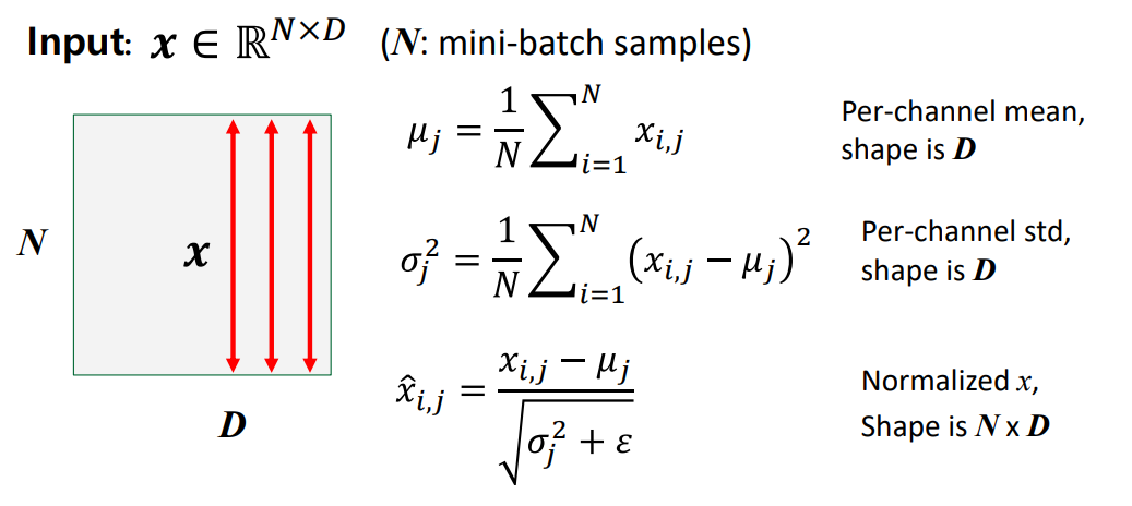 조금 더 자세히 살펴보면, Mini-Batch의 Size는 $N$, 입력 데이터의 데이터 $x$의 길이가 $D$일 때, 아래의 수식을 기반으로 Batch Normalization이 진행된다. Mini-Batch 단위의 평균 $\mu_{i, j}$와 분산 $\sigma^2_j$를 계산한 뒤 Mini-Batch 단위로 Normalization 시킨다.