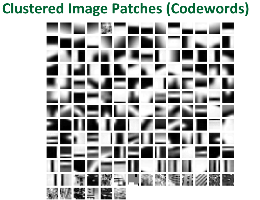 Image Patch를 기반으로 생성한 Codewords(Visual Words)를 살펴보자. 각 Patch 단위로 추출한 Feature들을 Clustering 하여 생성한 Cdoewords이다. 이를 기반으로 영상을 표현하는 방법은 결국, 영상에서 동일한 크기의 Patch를 생성해 Codewords와 유사한 Patches를 찾아 Histogram을 계산하여 영상을 하나의 Vector로 표현한다. 이 Vector는 각 Codeword의 빈도를 요소로 하는 Feature Vector이다.