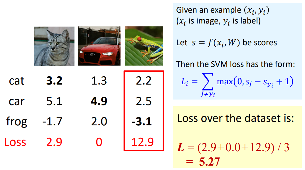 오른쪽 아래 수식을 잘 이해하면 되는데, $s_j$는 $j \neq y_i$인 Class Score, $y_i$는 정답 Class Score이다. 즉, SVM Loss는 정답 Class Score가 다른 것보다 Margin만큼 더 커야 Loss를 0으로 할당한다. 아래 예시에는 Margin이 1이 되는 것이다.