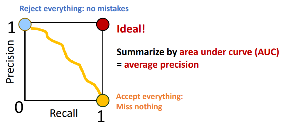 따라서 아래와 같이 Recall-Precision Curve(Average Precision)의 면적(AUC)로 성능을 평가하게 된다.