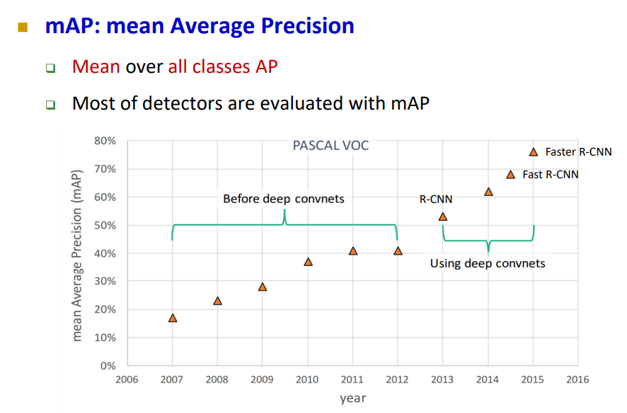앞선 AUC를 계산하는 것은 하나의 클래스에 대해서만 수행했다. 이를 전체 클래스에 대하여 수행하고 평균 낸 것이 mAP이며, 이를 기반으로 모델의 성능을 비교하는 것이 일반적이다.