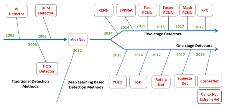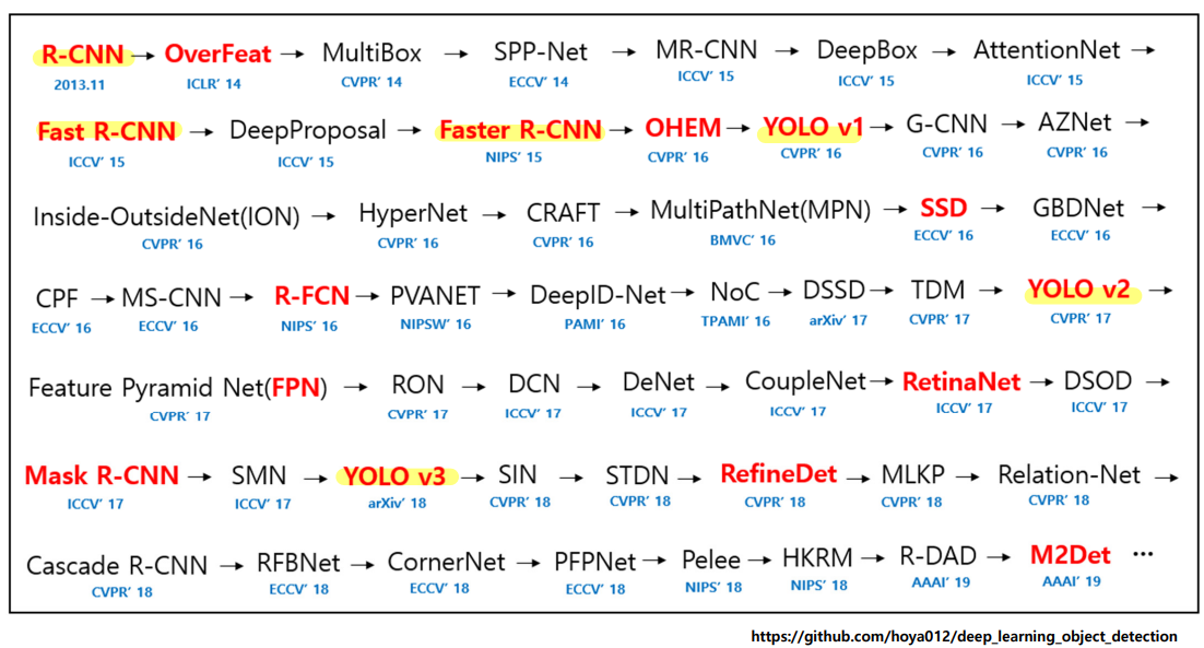 Object Detection Task를 위한 Deep Learning의 발전은 아래와 같다. 특히 YOLO 계열과 R-CNN 계열은 논문을 직접 살펴볼 필요가 있다고 생각한다.